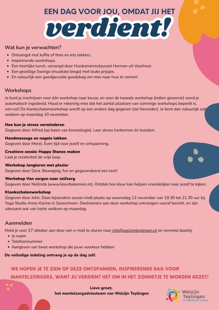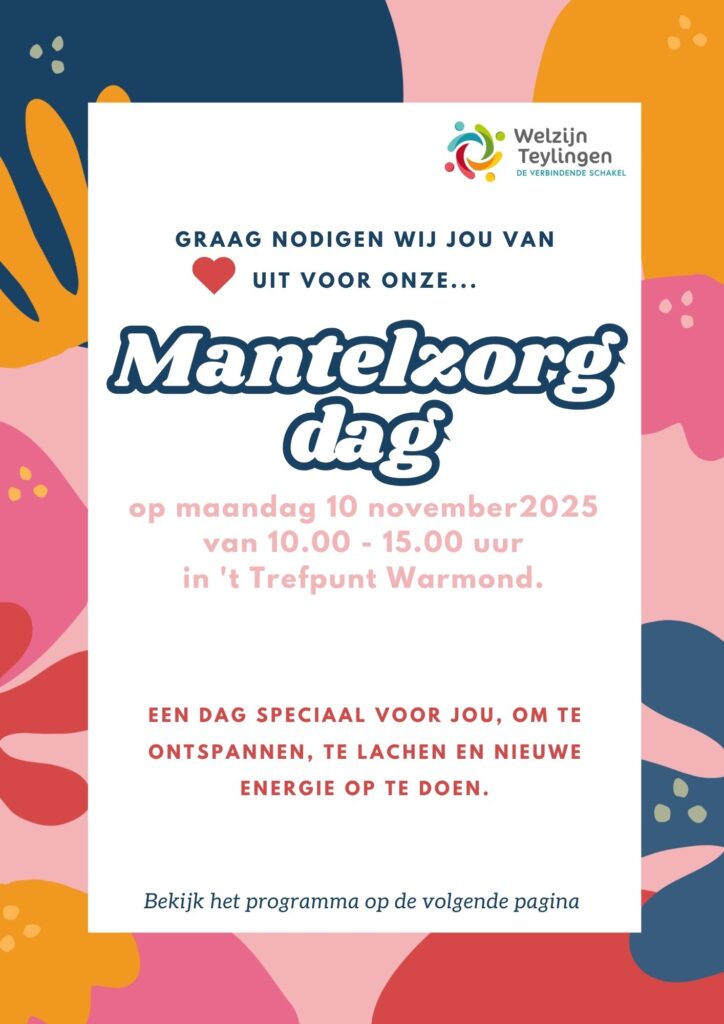 Maandag 10 november organiseren we een Mantelzorgdag voor alle mantelzorgers uit de gemeente Teylingen. Deze speciale dag staat volledig in het teken van ontspanning, ontmoeting en erkenning voor mensen die zorgen voor een partner, kind, familielid, buur of vriend. Deelnemen is gratis en iedereen die mantelzorger is in Teylingen is van harte welkom.